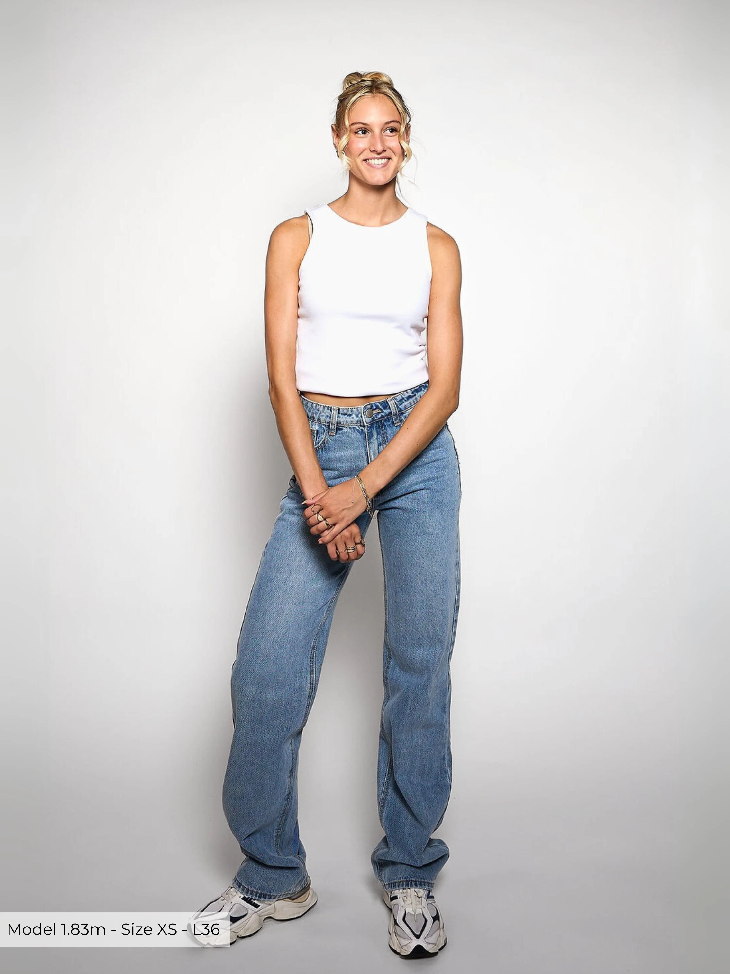 Deze blauwe jeans is allesbehalve basic. Gemaakt van een stevige, dikke denim zonder stretch voor een echte vintage feel. De destroyed details aan de voorkant geven een stoere uitstraling, terwijl de stiksels op de achterzakken zorgen voor een subtiel accent.