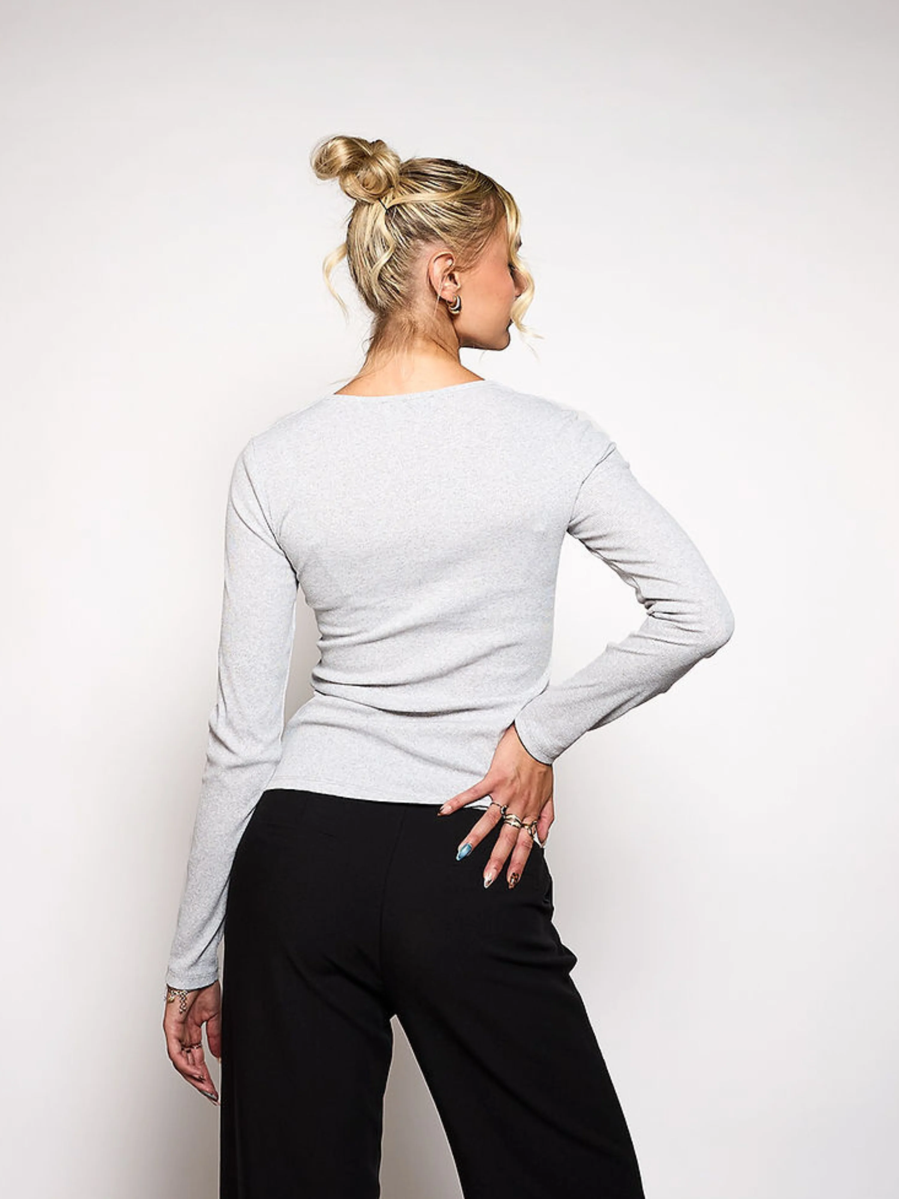 De Nala top met knopen is dé perfecte basic voor lange meiden die stijl en comfort willen combineren. Speciaal ontworpen voor vrouwen vanaf 1.75m, biedt deze grijze top een flatterende pasvorm met extra lengte in zowel de mouwen als het lijf. De subtiele knoopdetails geven een elegante touch aan deze veelzijdige must-have.